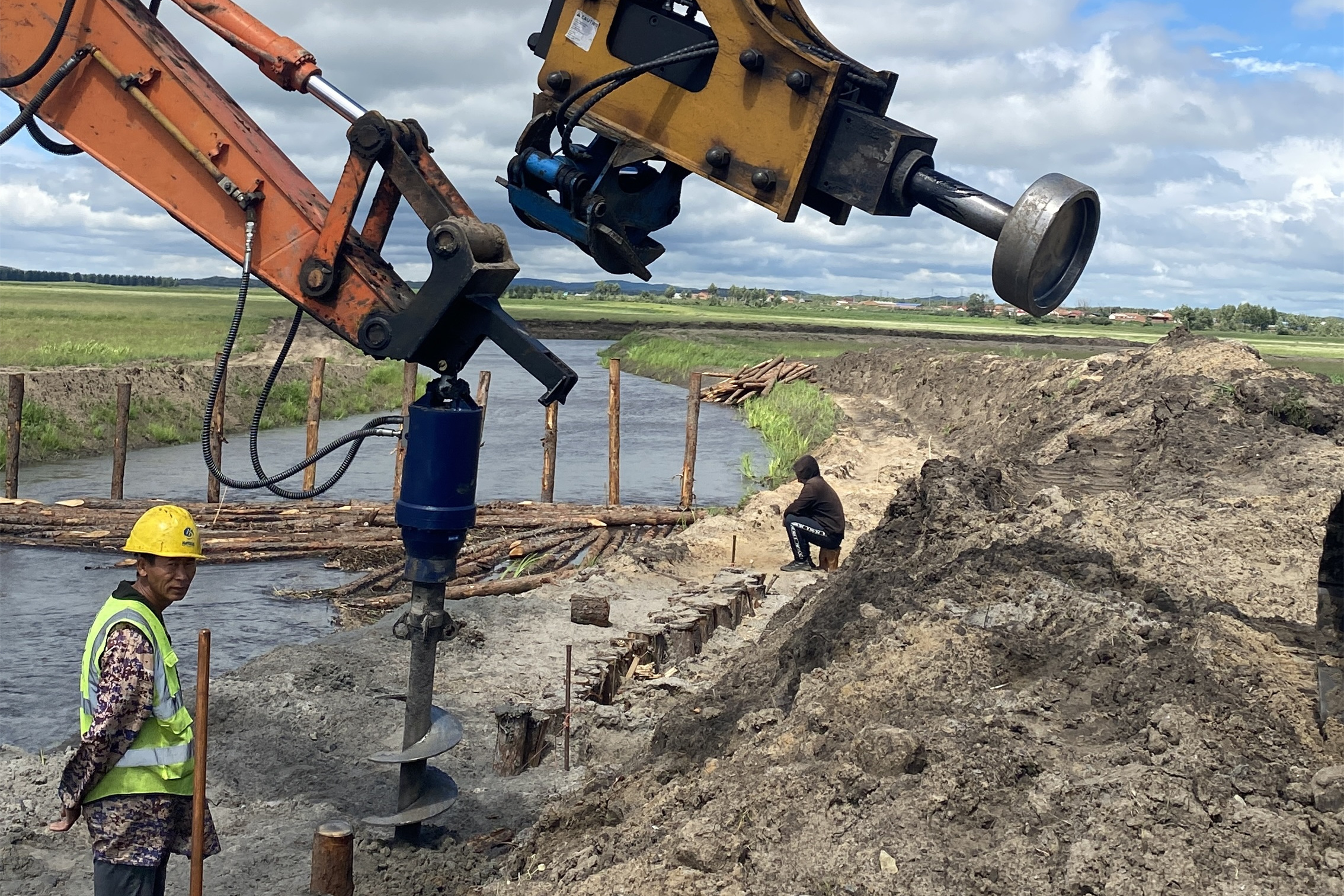 改造魚塘,堤壩用木樁加固為了穩定壩的基礎,兩邊用松木樁固定;相對來說木樁成本較低。